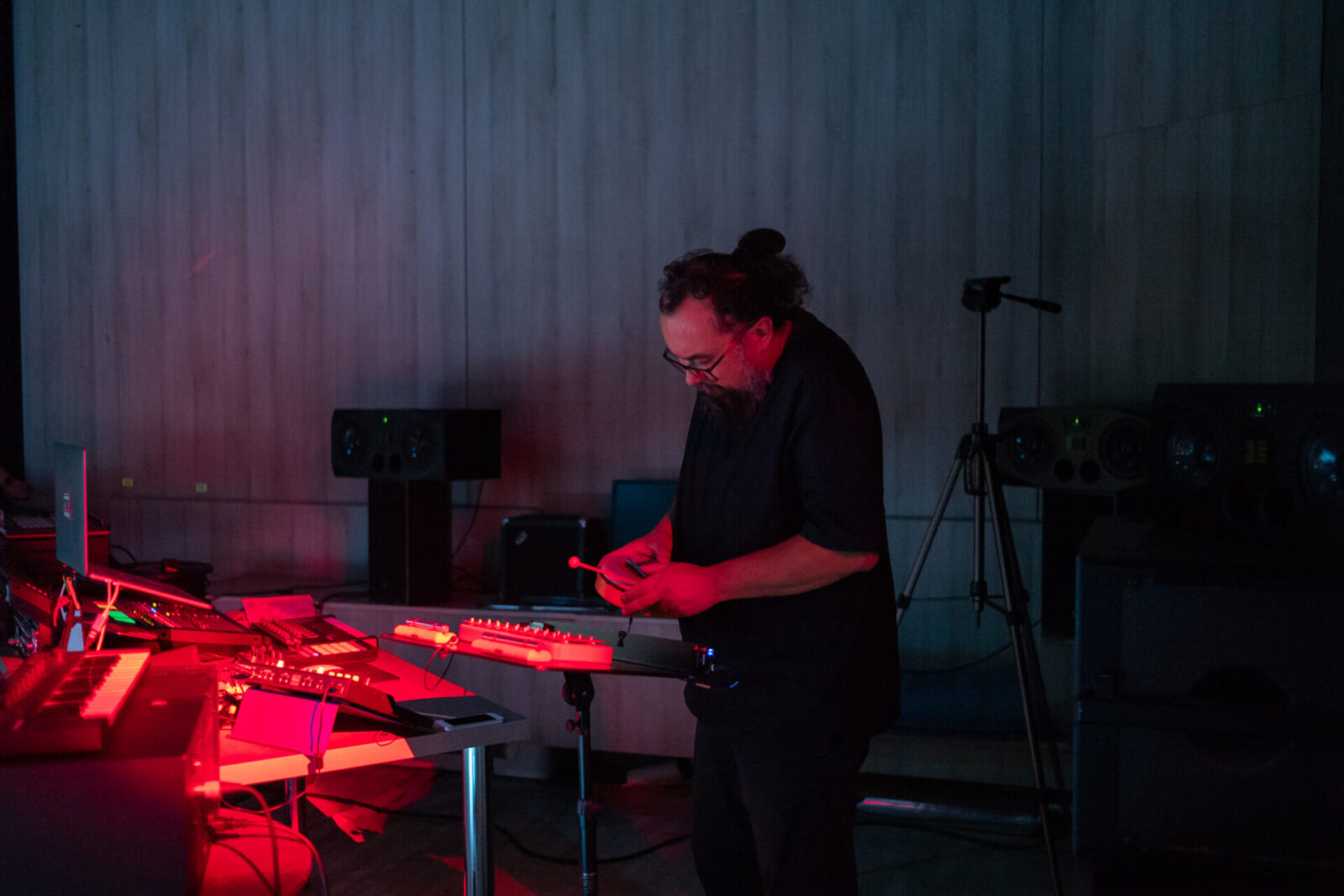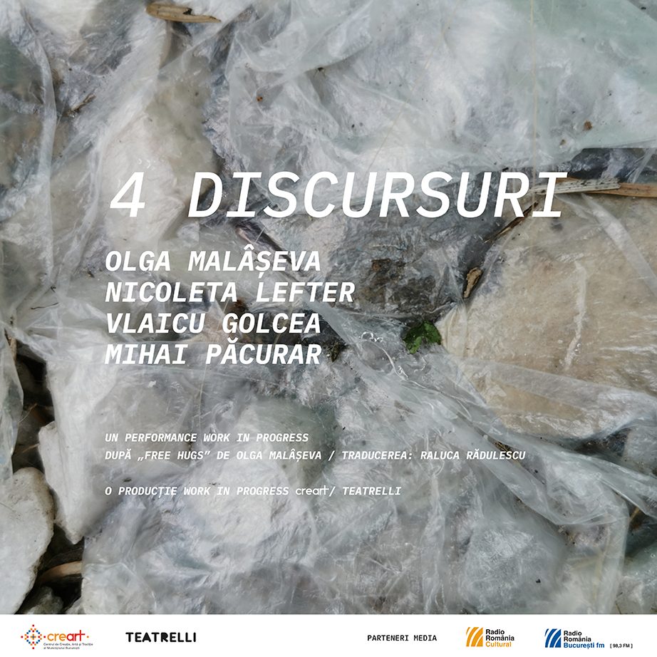 „4 Discursuri” este un experiment performativ care investighează intersecția dintre dramaturgie, prezență scenică, artă vizuală și sunet, propunând un format atipic, în afara convențiilor teatrale clasice. Spectacolul nu pornește de la un text fix, ci de la un proces de cercetare artistică, în care fiecare dintre cele patru arte prezente în același spațiu își expune propriul discurs, generând un dialog deschis și imprevizibil.