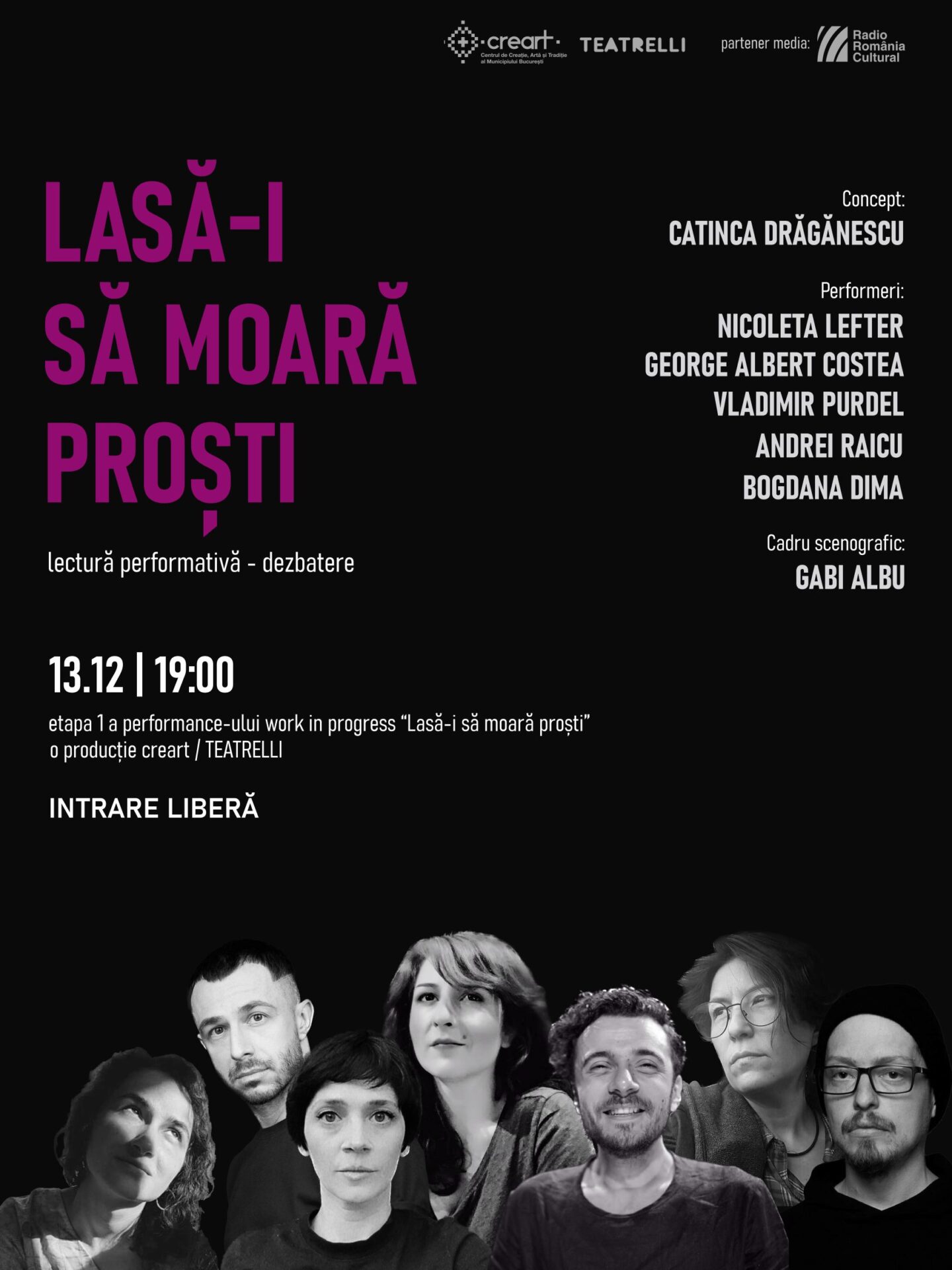 „Folosind articole din presă, repere culturale, manuale, istorii personale și interviuri, artiștii investighează propriul proces de devenire ȋntr-o ȋncercare de chestionare și recuperare identitară. Lasă-i să moară proști este un spectacol despre războiul interior și războiul exterior, despre apartenență și comunitate, despre cine suntem și cum ne regăsim ȋn ceea ce trăim.” – Catinca Drăgănescu